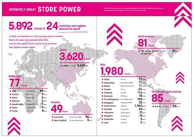 • DAISO ได้ขยายสาขาใหม่ไม่เพียงแต่ในประเทศญี่ปุ่นเท่านั้น ยังมีการขยายสาขาไปยังประเทศอื่นๆ ด้วย ทั้งในประเทศตะวันออกกลาง แอฟริกา  อเมริกาเหนือ  อเมริกาใต้  เอเซีย  โอเชียเนีย  รวมทั้งหมดประมาณ 2,300 สาขา